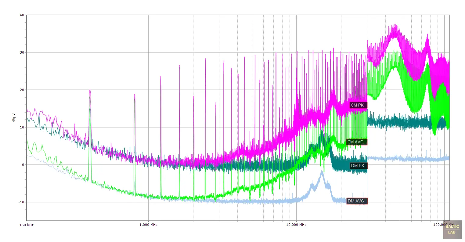 For reliable differential- and common-mode measurements that can be used directly for line-filter design, a properly characterized combiner paired with a measurement receiver or spectrum analyzer should be used. In my setup, the TekBox TBLM2 LISN Mate is used [11]. It provides calibrated correction factors from 9 kHz to 110 MHz and functions as a dedicated common-mode/differential-mode separator. The LISN Mate connects to the outputs of both LISNs, and the isolated differential or common-mode component can then be taken from its respective output.