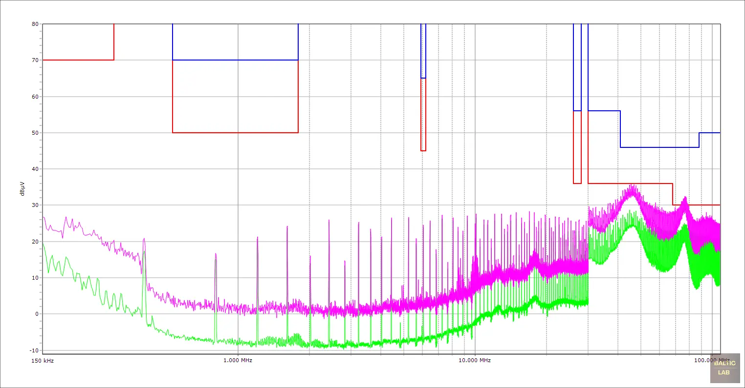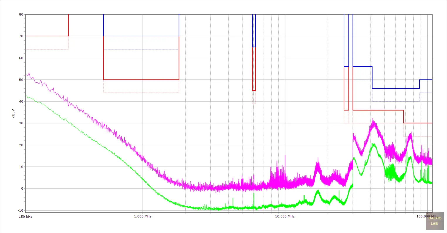 Figure 17: Conducted emissions measurement of a DUT with CISPR 25 Class 3 limits; peak (purple) and average (green) spectra shown alongside average limit (red) and peak limit (blue)