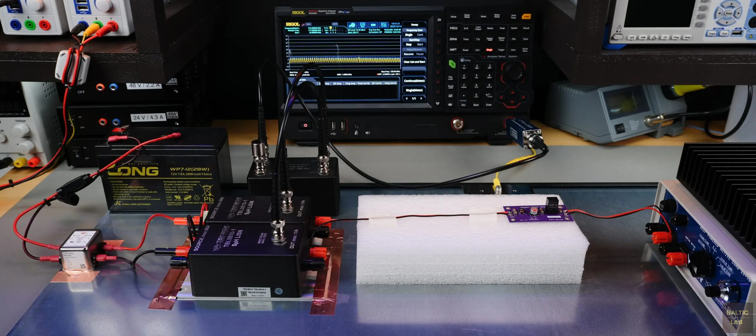 Figure 21: Modified test setup using a sealed lead-acid battery as a low-noise power source, with the LISN Mate installed for differential- and common-mode separation