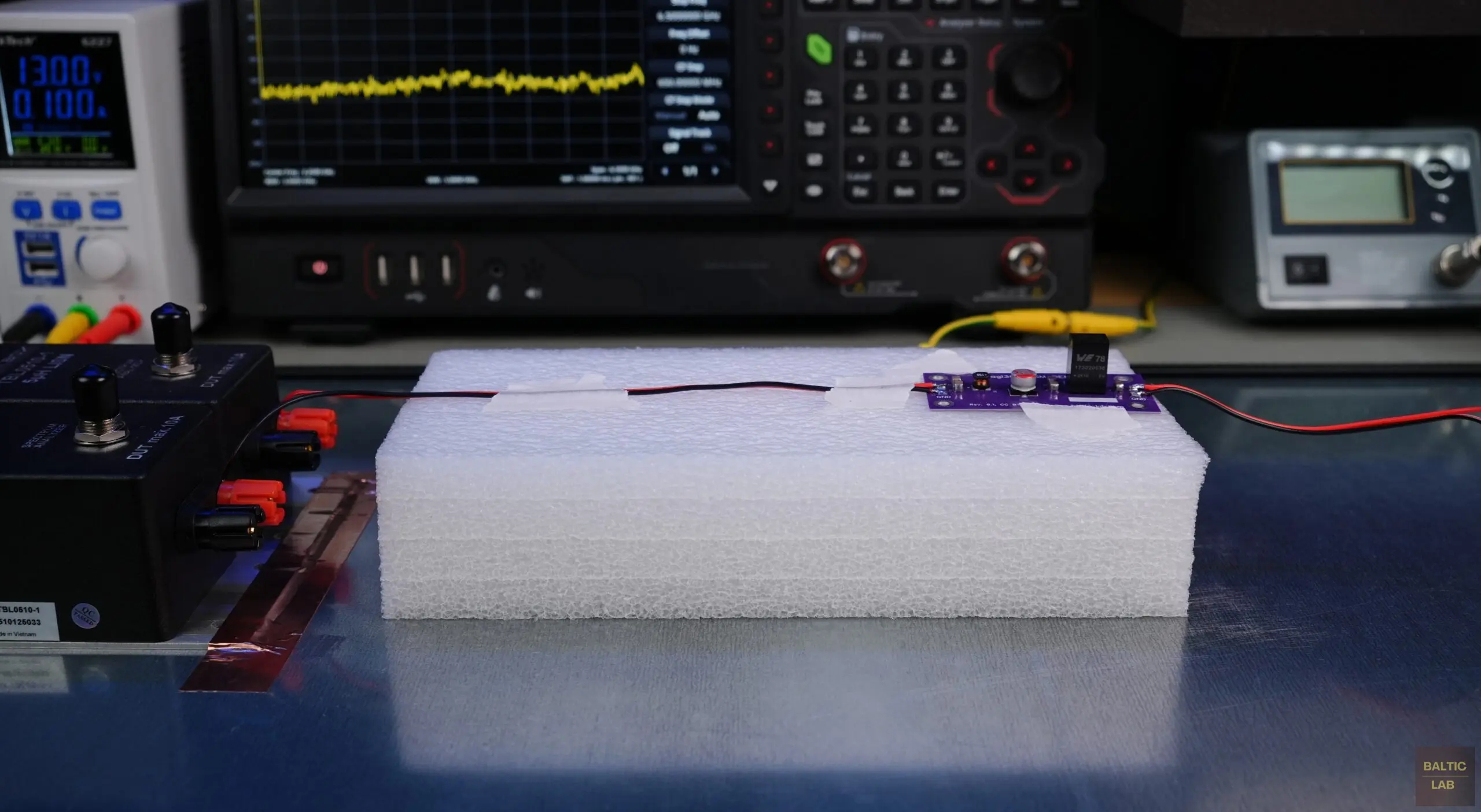 As a useful side note: The minimum ground-plane size for conducted emissions measurements using the current method is 250 cm × 40 cm, and for radiated emissions measurements it is 100 cm × 200 cm. If you plan to perform those tests as well, it may be sensible to invest directly in a properly sized ground plane, and a larger bench. 🙂