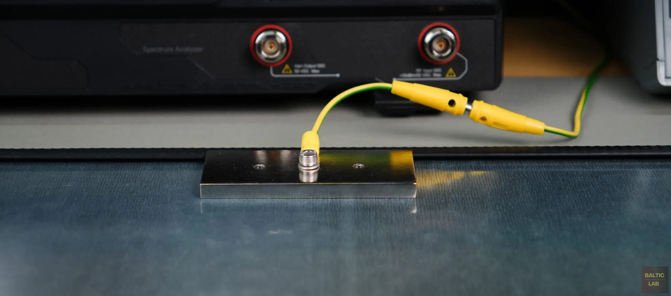 Ordinarily, the reference ground plane would be bonded to the shielded room, with ground straps spaced no more than 30 cm apart. In addition, each strap must maintain a length-to-width ratio no greater than 7:1 [1]. Due to the lack of a suitable shielded room to bond to, this requirement is also not fully implemented. Instead, a single 6 mm² grounding wire is used. While this simplified grounding approach is sufficient for pre-compliance testing, it may slightly affect repeatability and introduce small measurement variations compared to a fully compliant setup.