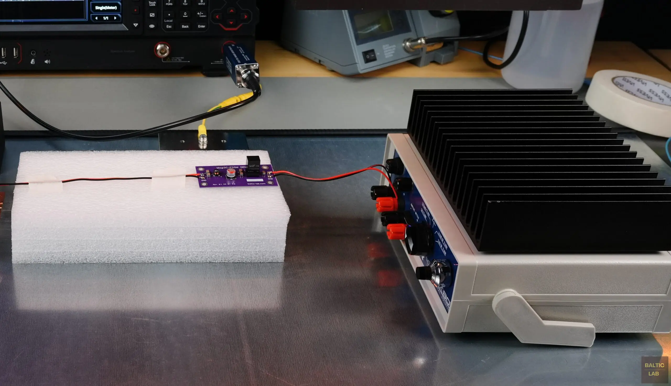 According to the standard, measurements must be conducted in an anechoic chamber or in a shielded room [1]. This requirement conflicts with a truly benchtop pre-compliance setup and is therefore not implemented in my configuration. While skipping a fully shielded environment simplifies the setup, it can increase background noise and external interference, potentially affecting measurement accuracy. Therefore, a background scan should be performed prior to testing to ensure that any external interference is at least 6 dB below the desired limit.