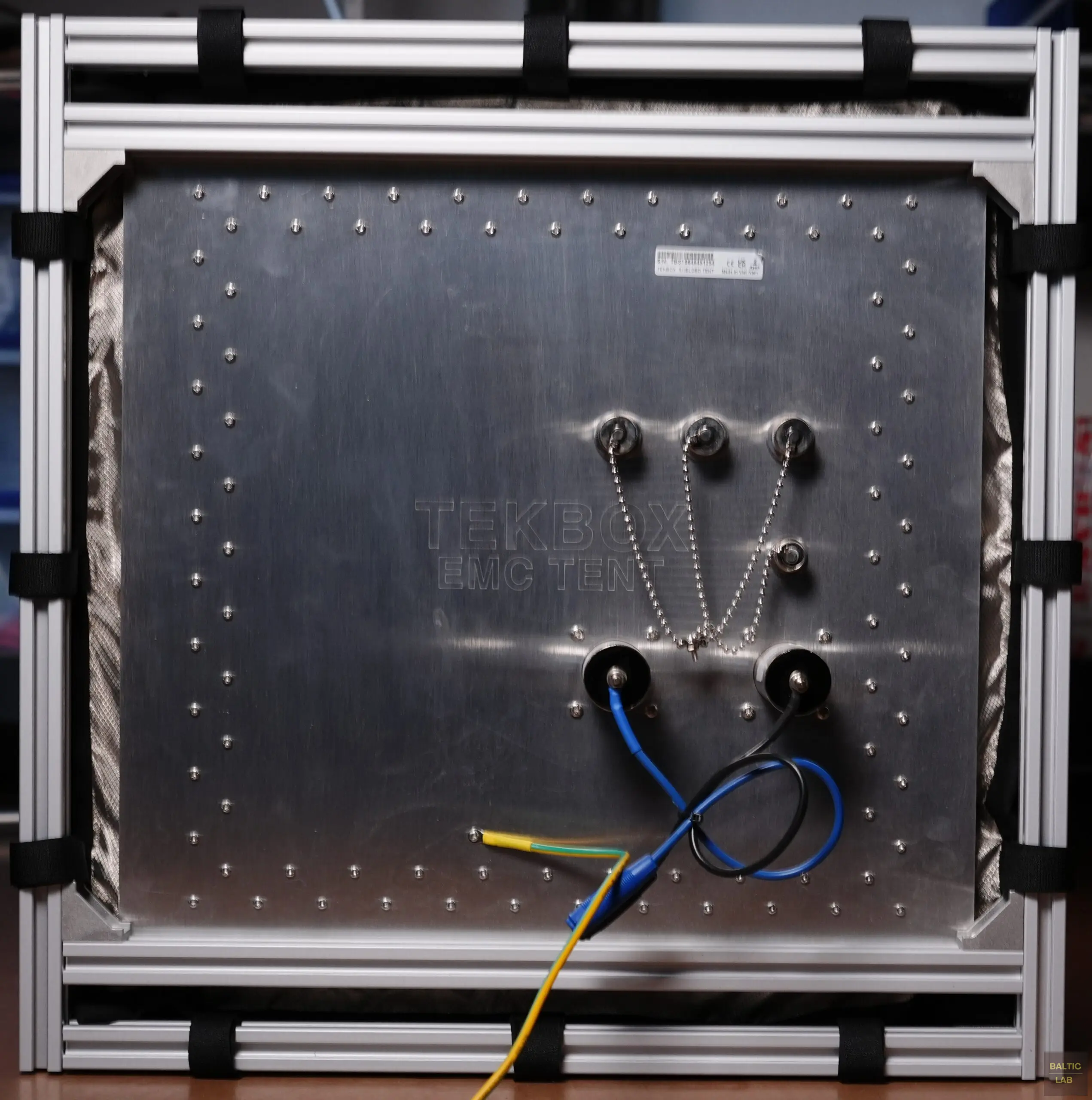 Figure 22: Shielded tent made from conductive fabric and aluminium profiles, showing the base plate with installed power-supply line filters and partially visible N- and BNC-type connectors