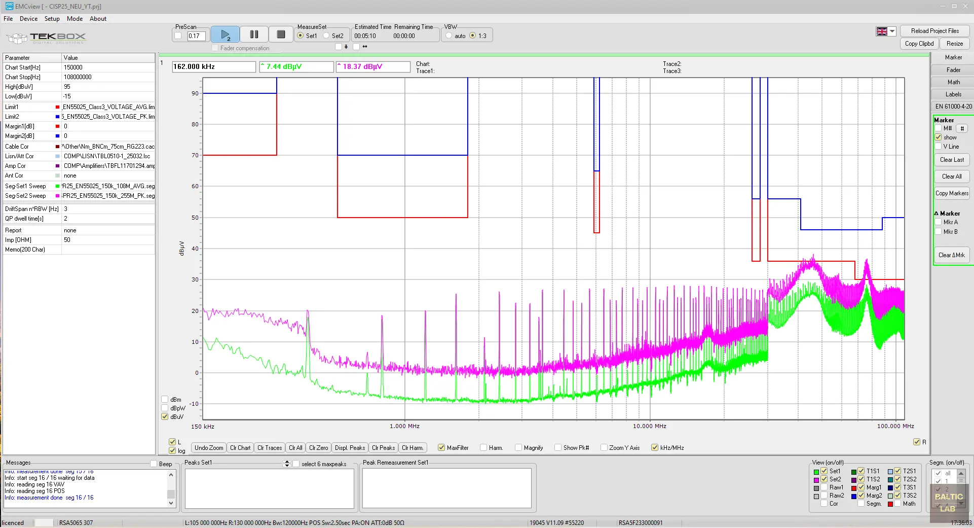 Figure 15: EMCview software configured with CISPR 25 Class 3 limits and correction factors for the LISNs, transient limiter, and BNC-to-N RG223 cable